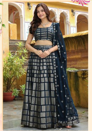 Radiate royal charm with this elegant Dark Blue Georgette Lehenga Choli Set, featuring intricate thread and sequins embroidery. A perfect choice for weddings, festive occasions, receptions, and bridal parties, this semi-stitched lehenga set from Kota Silk brings tradition and elegance together in one timeless ensemble.