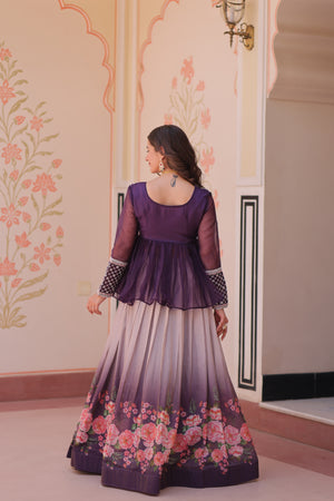 Elegant Purple Cosmos Printed Lehenga Choli with Bead Embroidered Peplum Top – Full Stitched Set