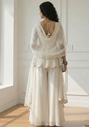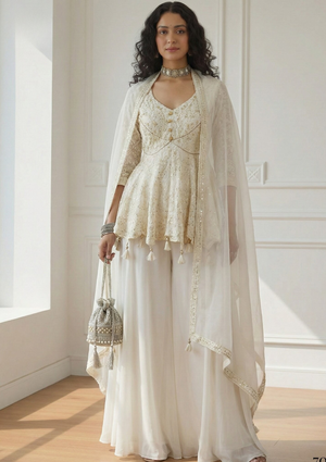 Step into effortless elegance with this stunning Georgette Top, Sharara & Dupatta Indo-Western Set, exclusively available at KOTASILK. Crafted for women who love modern fusion fashion, this outfit beautifully balances traditional Indian charm with contemporary styling, making it ideal for festive occasions, weddings, parties, and elegant evening gatherings.