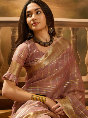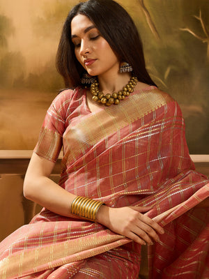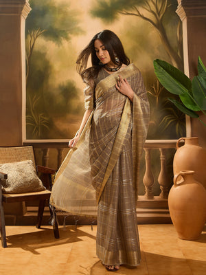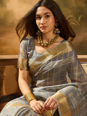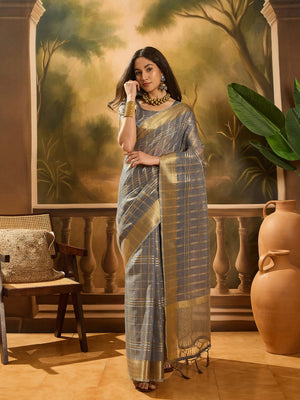 Add a touch of ethereal charm to your wardrobe with this Khadi Organza Jacquard Saree from Kota Silk. Crafted from airy, lightweight khadi organza, this saree offers a graceful flow and a regal jacquard weave that blends tradition with sophistication.