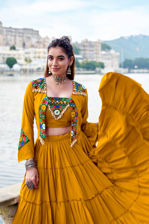Navratri 2025 Pure Rayon Mustard Lehenga Choli with Mirror Gamthi Work & Koti