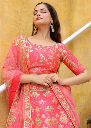 Peach Slub Silk Lehenga Choli with Sequins & Zari Embroidery – Semi-Stitched with Net Dupatta