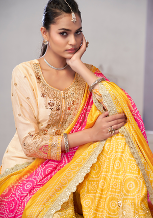 Unveil pure sophistication with this Premium Chinnon Readymade Salwar Suit, designed for effortless elegance and maximum comfort. This free-size stitched masterpiece blends traditional artistry with modern styling—perfect for weddings, festive occasions, and special gatherings.