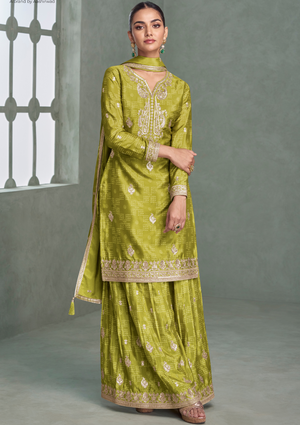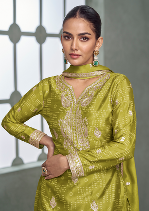 Premium Green Color Chinnon Silk Salwar Suit with Plazzo & Dupatta – Free Size Stitched Designer Suit