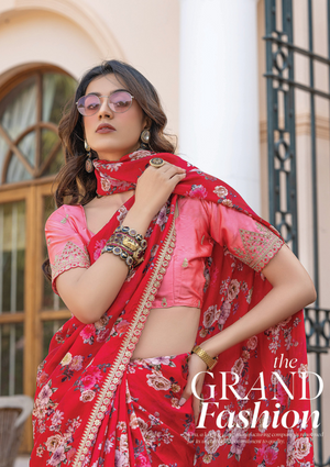 Pure Viscose Dola Silk Saree with Floral Print & Designer Embroidered Blouse – Party & Festive Wear