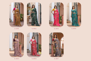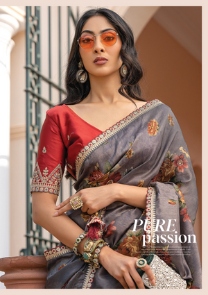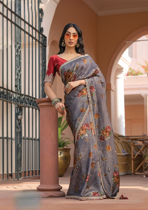 This saree is paired with a designer embroidered blouse, blending traditional embroidery with contemporary styling for a standout look. Its charm lies in the fusion of rich fabric, elegant prints, and handcrafted detailing, making it a must-have statement piece.