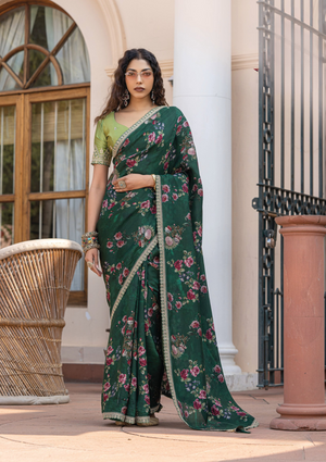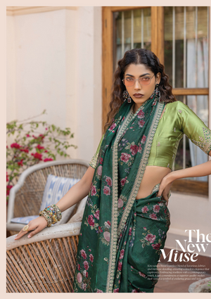 This saree is paired with a designer embroidered blouse, blending traditional embroidery with contemporary styling for a standout look. Its charm lies in the fusion of rich fabric, elegant prints, and handcrafted detailing, making it a must-have statement piece.