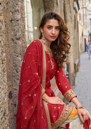 Real Chinon & Tabi Silk Digital Red Color Salwar Suit with Embroidery – Sizes L to 3XL