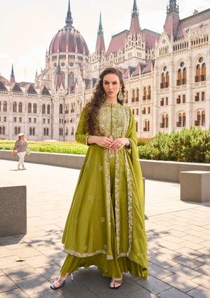 Radiate elegance with this Real Premium Silk & Organza Salwar Suit, designed with heavy embroidery on both front and back. Featuring a stylish front-cut long top, plazzo pant, and embroidered dupatta, this free-size stitched designer suit is perfect for weddings, receptions, cocktail parties, and festive occasions.