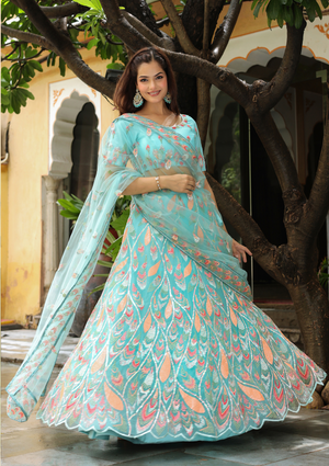 Elevate your ethnic wardrobe with this ethereal Sky Blue Lehenga Choli Set, crafted in lightweight soft net and adorned with intricate thread and sequin embroidery. Perfect for festive celebrations, engagement parties, weddings, and receptions, this semi-stitched set from Kota Silk offers elegance, comfort, and effortless charm.