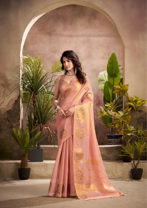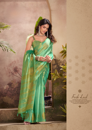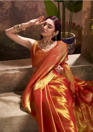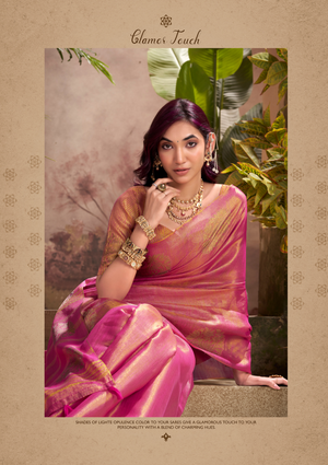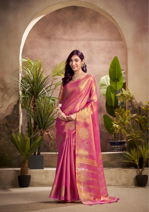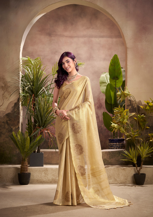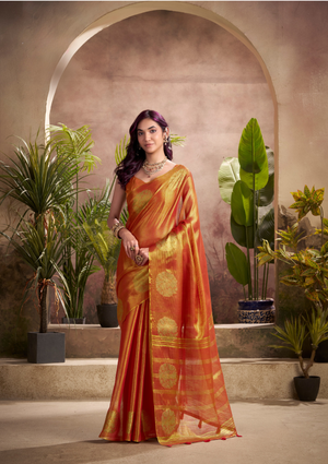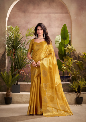 Step into elegance with our premium Tissue Banarasi Silk Saree, a true celebration of traditional Indian craftsmanship. Woven with intricate golden zari and crafted from tissue silk, this saree shimmers with a regal texture and offers a featherlight drape—perfect for weddings, receptions, and grand celebrations.