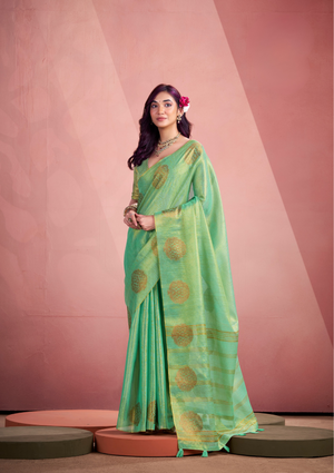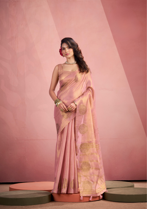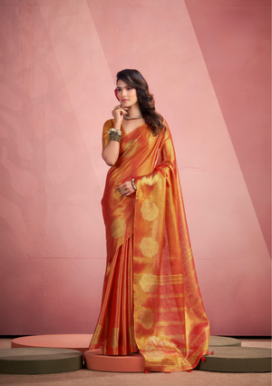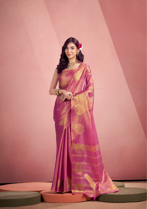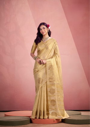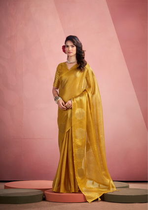 Elevate your festive and wedding look with this Tissue Fancy Weaving Banarasi Saree, beautifully designed with intricate zari patterns and premium craftsmanship. Made from high-quality tissue fabric, it offers a lightweight, shimmery drape that blends elegance with comfort. Perfect for weddings, receptions, parties, and festive occasions, this saree captures the essence of luxury and tradition.